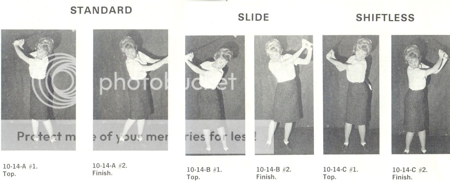 Homer's original definition of the Slide Hip Turn is depicted in the photos. Namely, "Slide with no appreciable Turn". In fact, this definition remains encapsulated in both the photos and the Chapter 11 summary of the 14th Component: Turn -- Zero Shift -- Free In both directions. So what gives? Beginning with the 5th edition, Homer changed the definition to read: "Slide with delayed Turn". [Italics mine.] Until the 7th edition (published posthumously 23 years after Homer's death), all this lay under the radar. Then, the Slide Hip Turn Variation (10-14-B) became the listed Variation in both the Basic Stroke Patterns (12-1-0 and 12-2-0). During Homer's lifetime and through six editions, the Variation had always been the Standard Hip Turn (10-14-A), i.e., a free Turn with a Weight Shift in both directions. Now, players referring to the Stroke Patterns and aspiring to Golfing Perfection are left with a horrific photographic impression of the listed Variation. An impression only confirmed when referenced against the summary characteristics of Chapter 11. All of which is a shame. Truly, a shame. :crybaby: |